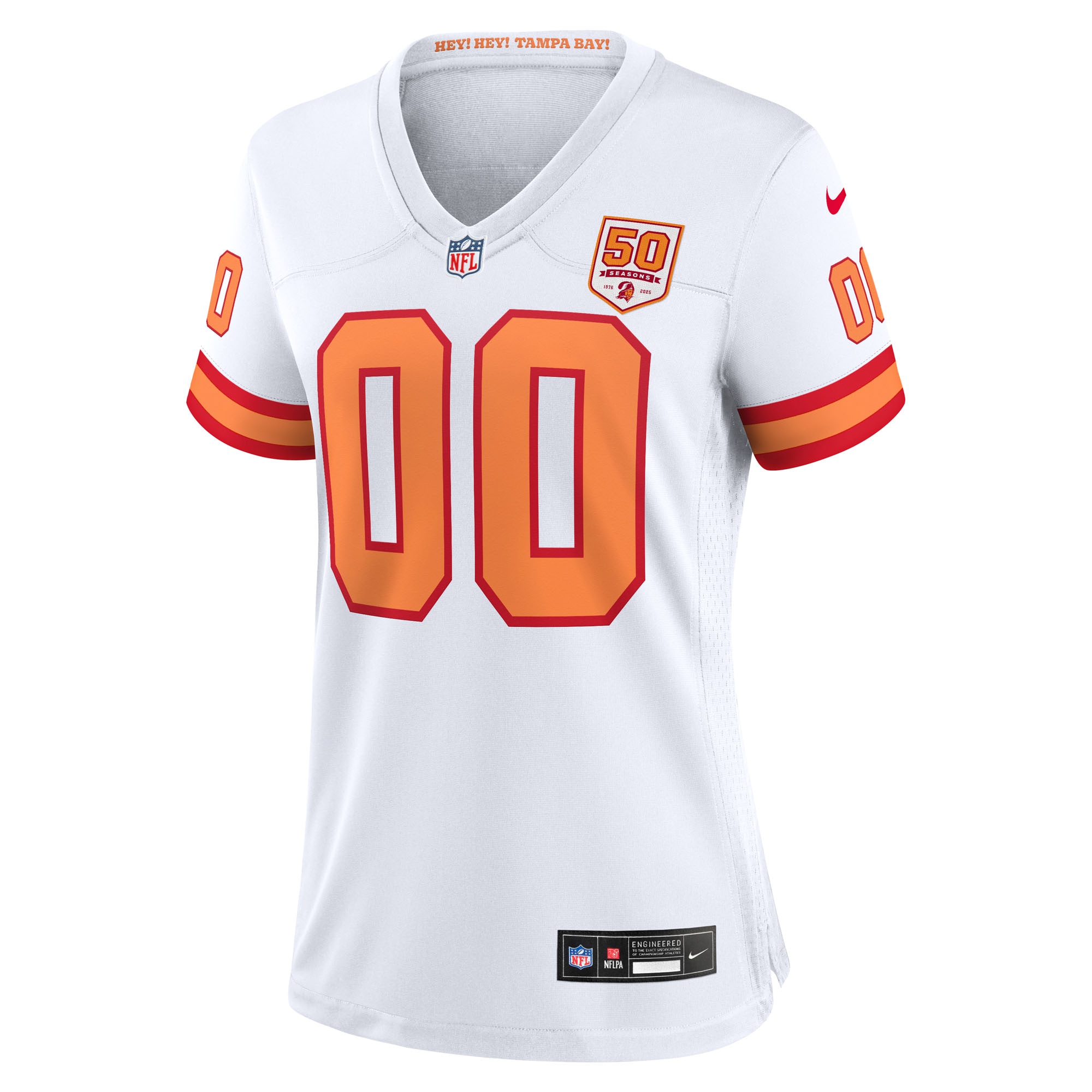 We want fans to celebrate their fandom by customizing and personalizing certain products. For these customizable products, including jerseys, we invite customers to tell us how they would like their preferred name or other text to appear by typing that text into the field indicated. However, just because a customer is able to type proposed customization text into the field and is able to complete the order through the website, not all proposed customization text will be accepted. Please note, Fanatics may reject and cancel any customization order for any reason, including for messages that are deemed offensive or inappropriate. This ’76 Tampa Bay Buccaneers 50th Season Custom Game Jersey from Nike embodies the spirit of the franchise with its classic design and commemorative details. Featuring a loose fit for comfortable movement, mesh side panels for breathability, and stitched NFL Shield at the collar, this jersey is built for both performance and pride. The screen-printed name, numbers, and team details, along with a satin woven jock tag, complete this authentic piece, making it a must-have for any dedicated Buccaneers fan looking to honor the team’s past and present.