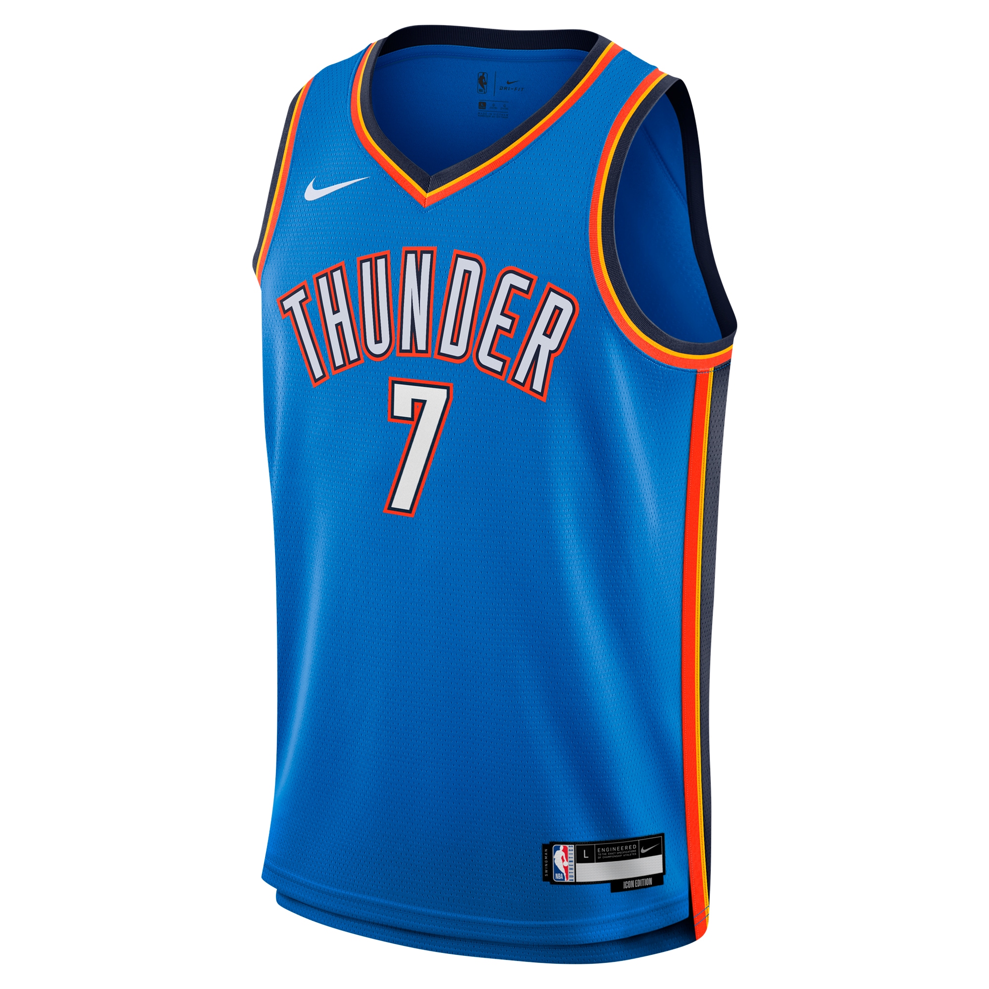 Let your young fan rep their favorite Oklahoma City Thunder star with this Chet Holmgren Swingman Jersey from Nike. This jersey is crafted from double-knit fabric with a mesh texture, providing a comfortable and breathable feel. The Dri-FIT® technology wicks away moisture, keeping them cool and dry whether they’re shooting hoops at the park or cheering on Chet Holmgren and the Oklahoma City Thunder from home. With heat-applied twill team and player details, this jersey showcases their team pride in style.