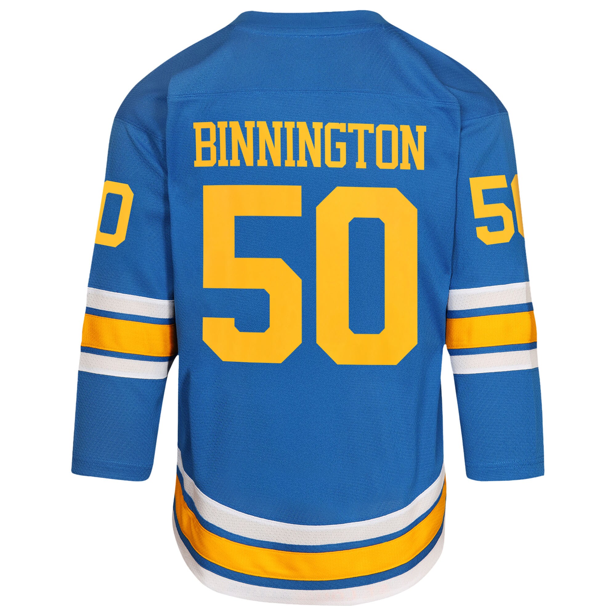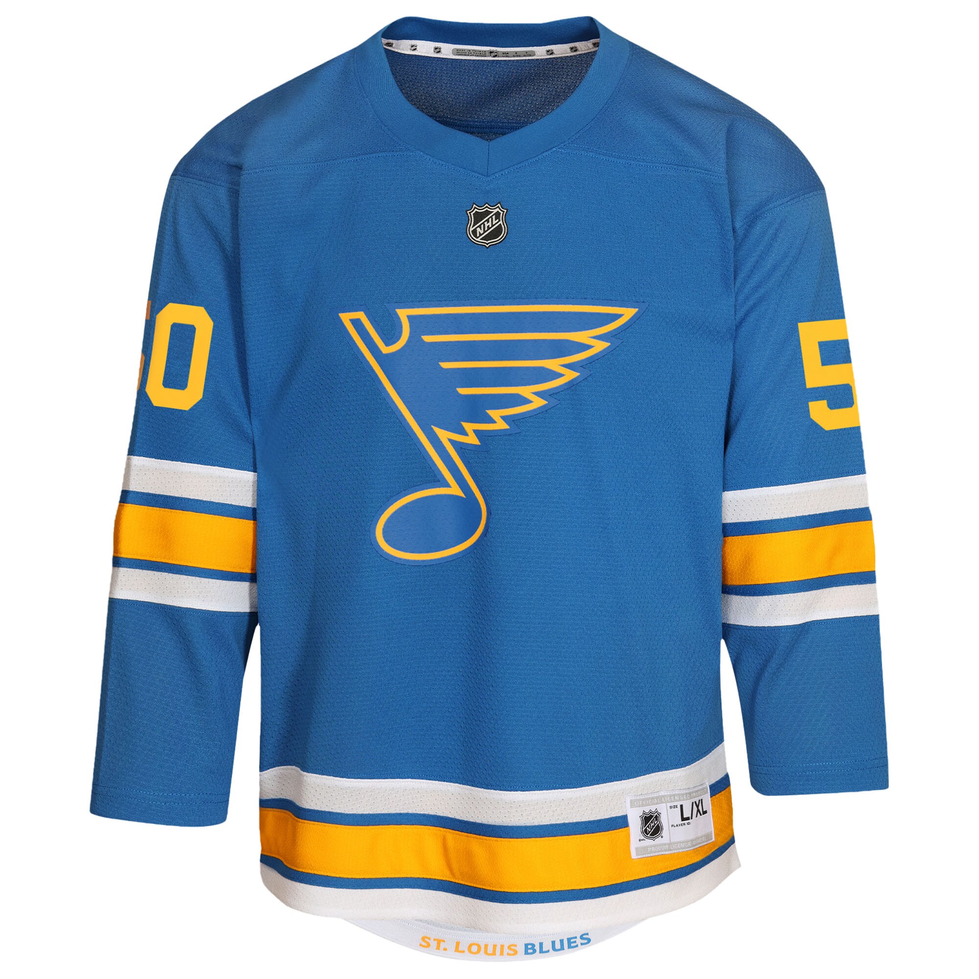 Get your young fan outfitted like their favorite St. Louis Blues players with this Jordan Binnington Home Replica Player Jersey. This officially licensed NHL jersey is crafted from durable polyester to withstand the excitement of every game. Its classic design features screen-printed graphics that showcase your St. Louis Blues pride, while the sewn-on stripes at the elbows and hem add a touch of authenticity. With its comfortable fit and eye-catching details, this jersey is the perfect way for your young fan to cheer on their favorite player.