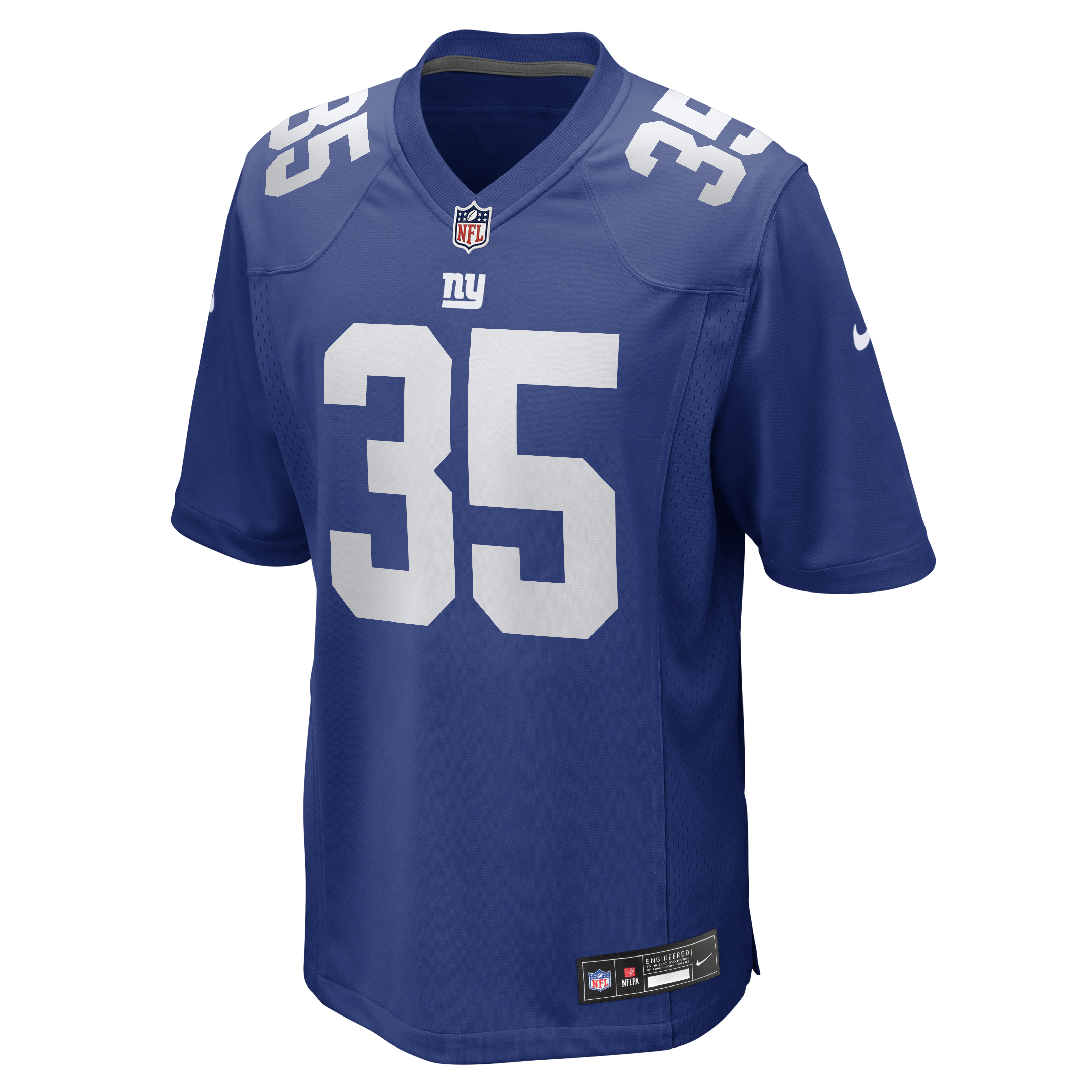 This LaMareon James Nike Game Jersey is an essential piece of gear for any New York Giants fan looking to highlight their favorite player. The heat-sealed name, number and team details provide a kickoff-ready look that elevates your excitement for game day. Made with comfort in mind, this New York Giants Team replica jersey delivers a standard, lightweight fit and features breathable mesh side panels for added ventilation.