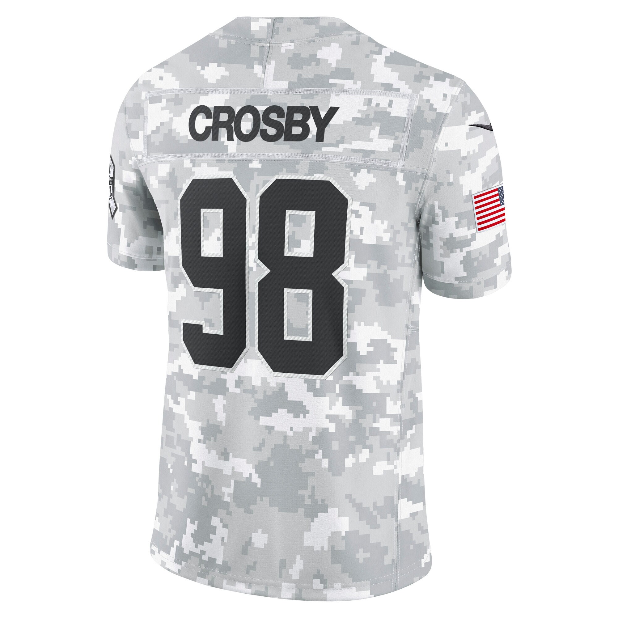 This Maxx Crosby Salute to Service Limited Jersey delivers an authentic touch on game day with premium twill team appliques and a tribute to those who serve their country. Its special design is dedicated to the NFL’s charitable initiative and features an allover arctic camo pattern and military-inspired details. Double pique fabric and sweat-wicking Dri-FIT technology provide consistent comfort as you represent the Las Vegas Raiders and active or retired service members. The NFL does not profit from the sale of Salute to Service products. Charitable contributions are awarded by the NFL Foundation to the NFL’s charitable partners. For more information, please visit www.NFL.com/Salute.