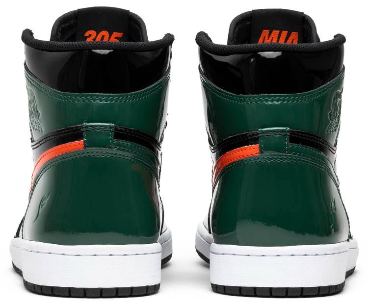 Jordan Brand teamed up with SoleFly to celebrate Art Basel Miami . the international art fair that takes place the first week of December every year. The SoleFly x Air Jordan 1 Retro High OG ‘Art Basel’ Friends & Family features a patent black leather upper with green leather overlays on the toe box . collar . and heel. The high top also boasts embossed Wings details . quilted tongue . and MIA and 305 lettering on the inside of the tongue. The shoe features alternating Swooshes . with a bright orange on the left lateral and right medial shoe . and green on the right lateral and left medial shoe.